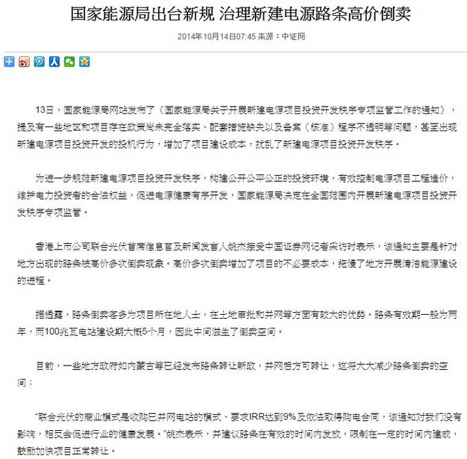 目前,一些地方政府如内蒙古等已经发布路条转让新政,并网后方可转让,这将大大减少路条倒卖的空间;