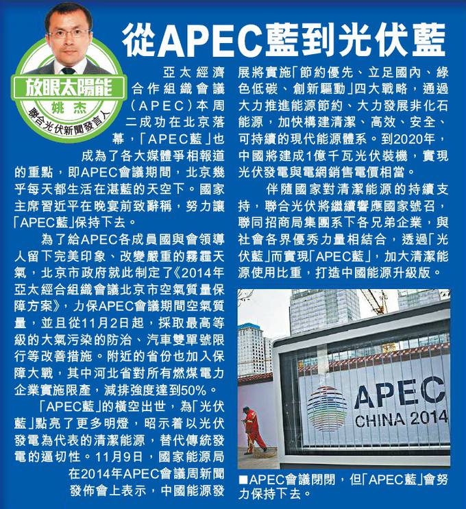 「APEC蓝」的横空出世,为「光伏蓝」点亮了更多明灯,昭示着以光伏发电为代表的清洁能源,替代传统发电的逼切性。11月9日,国家能源局在2014年APEC会议周新闻发布会上表示,中国能源发展将实施「节约优先、立足国内、绿色低碳、创新驱动」四大战略,通过大力推进能源节约、大力发展非化石能源,加快构建清洁、高效、安全、可持续的现代能源体系。到2020年,中国将建成1亿千瓦光伏装机,实现光伏发电与电网销售电价相当。
