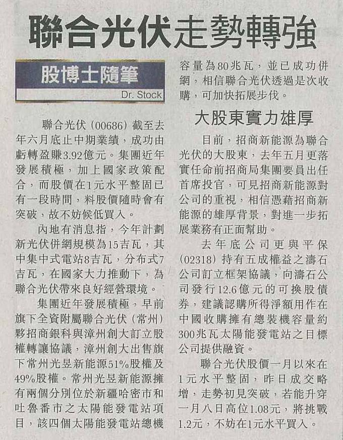 联合光伏(00686)截至去年六月底止中期业绩,成功由亏转盈赚3.92亿元。集团近年发展积极,加上国家政策配合,而股价在1元水平整固已有一段时间,料股价随时会有突破,故不妨候低买入。