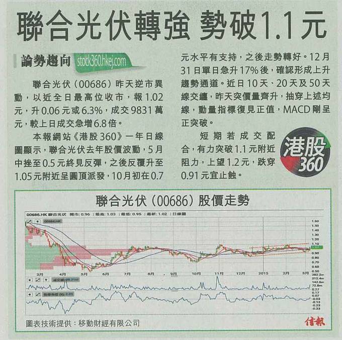 本报网站《港股360》一年日线图显示,联合光伏去年股价波动,5月中挫至0.5元终见反弹,之后反复升至1.05元附近呈圆顶派发,10月初在0.7元水平有支持,之后走势转好。12 月31日单日急升17%后,确认形成上升趋势通道。近日10 天、20 天及50 天线交缠,昨天突价量齐升,抽穿上述均线,动量指标复见正值,MACD 刚呈正突破。