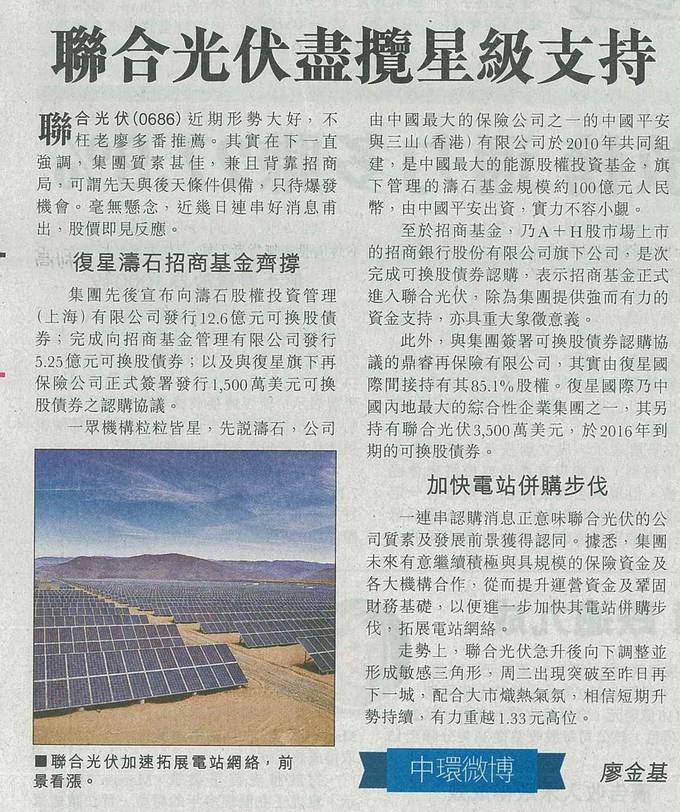 联合光伏(0686)近期形势大好,不枉老廖多番推荐。其实在下一直强调,集团质素甚佳,兼且背靠招商局,可谓先天与后天条件俱备,只待爆发机会。毫无悬念,近几日连串好消息甫出,股价即见反应。