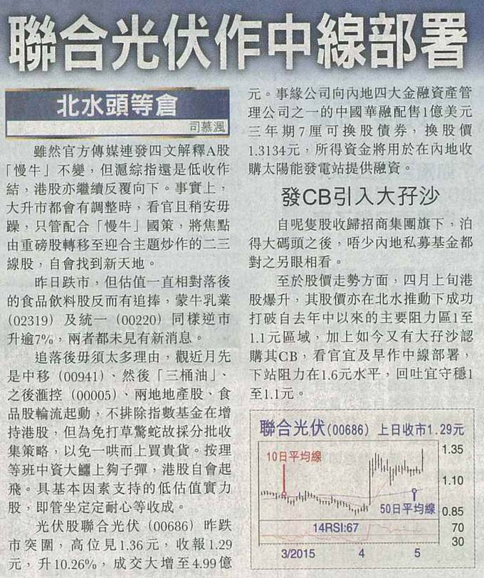 光伏股联合光伏(00686)昨跌市突围,高位见1.36元,收报1.29元,升10.26%,成交大增至4.99亿元。事缘公司向内地四大金融资产管理公司之一的中国华融配售1亿美元三年期7厘可换股债券,换股价1.3134元,所得资金将用于在内地收购太阳能发电站提供融资。