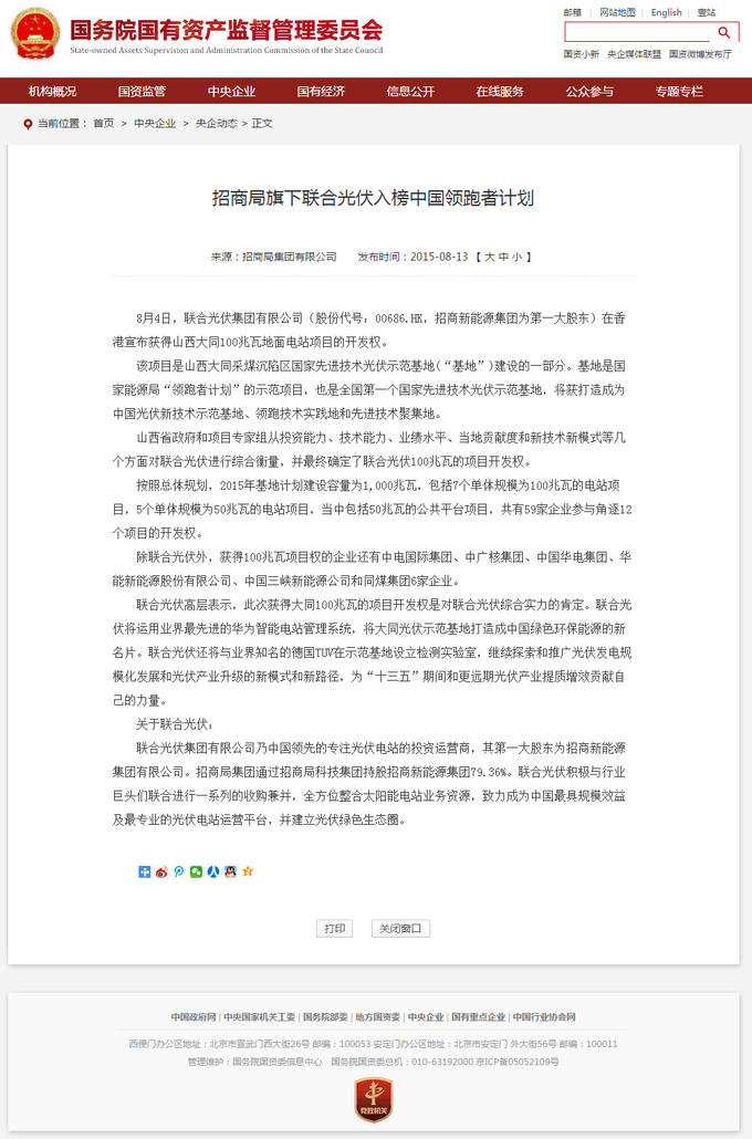 8月4日,联合光伏集团有限公司(股份代号:00686.HK,招商新能源集团为第一大股东)在香港宣布获得山西大同100兆瓦地面电站项目的开发权。