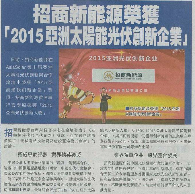日前,招商新能源在AsiaSolar第十届亚洲太阳能光伏创新与合作论坛中荣获「2015亚洲光伏创新企业」奖项,招商新能源首席执行官李原荣获「2015亚洲光伏创新人物」。