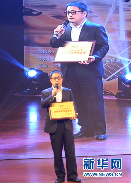 图为,国务院国有重点大型企业监事会主席赵华林为“2015年度中国能源绿色环保杰出企业”获得者颁奖。
