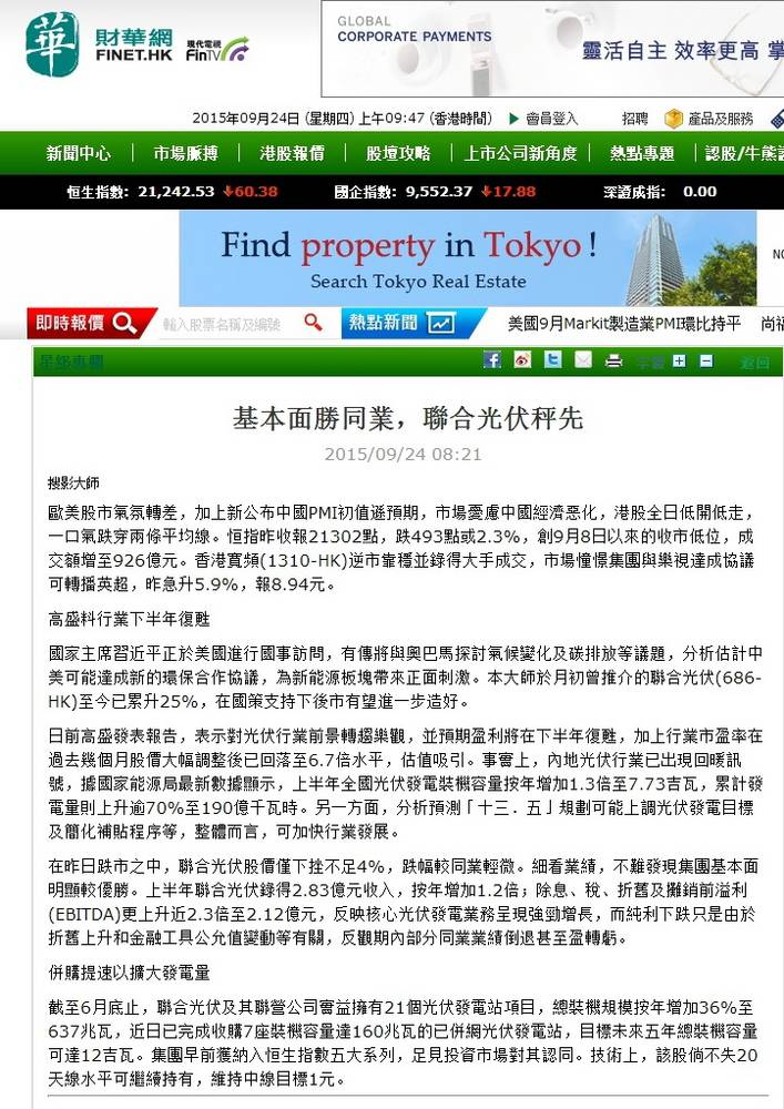 国家主席习近平正于美国进行国事访问,有传将与奥巴马探讨气候变化及碳排放等议题,分析估计中美可能达成新的环保合作协议,为新能源板块带来正面刺激。本大师于月初曾推介的联合光伏(686-HK)至今已累升25%,在国策支持下后市有望进一步造好。