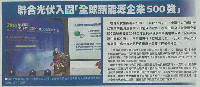 联合光伏集团有限公司(「联合光伏」),中国领先的专注光伏电站的投资运营商,日前欣然宣布,在第五届全球新能源企业500 强发布会暨2015 全球新能源发展高峰论坛中入围「全球新能源企业500 强」,同时还获得「发展潜力奖」。此外,联合光伏董事局主席兼首席执行官李原亦荣获「行业领袖奖」。