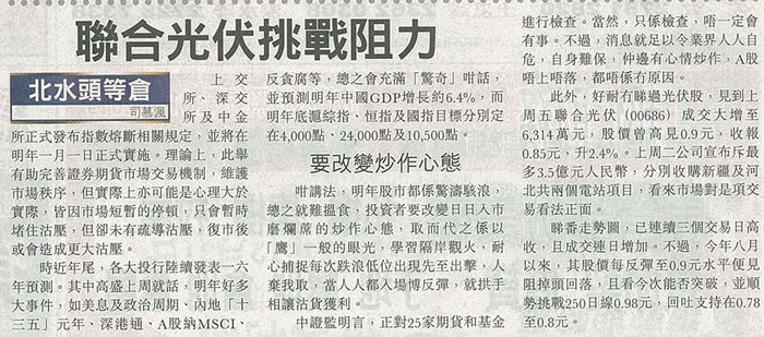 此外,好耐冇睇过光伏股,见到上周五联合光伏(00686)成交大增至6,314万元,股价曾高见0.9元,收报0.85元,升2.4%。上周二公司宣布斥最多3.5亿元人民币,分别收购新疆及河北共两个电站项目,看来市场对是项交易看法正面。