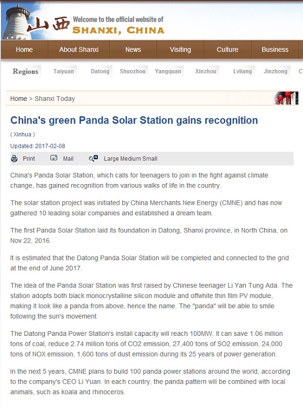 中国日报:中国熊猫绿色太阳能电站获得认可