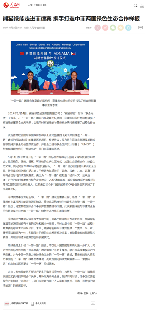 人民网:熊猫绿能走进菲律宾 携手打造中菲两国绿色生态合作样板