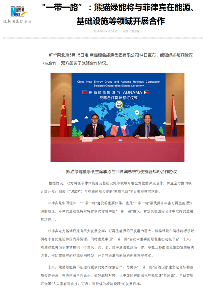 新华网:“一带一路”:熊猫绿能将与菲律宾在能源、基础设施等领域开展合作