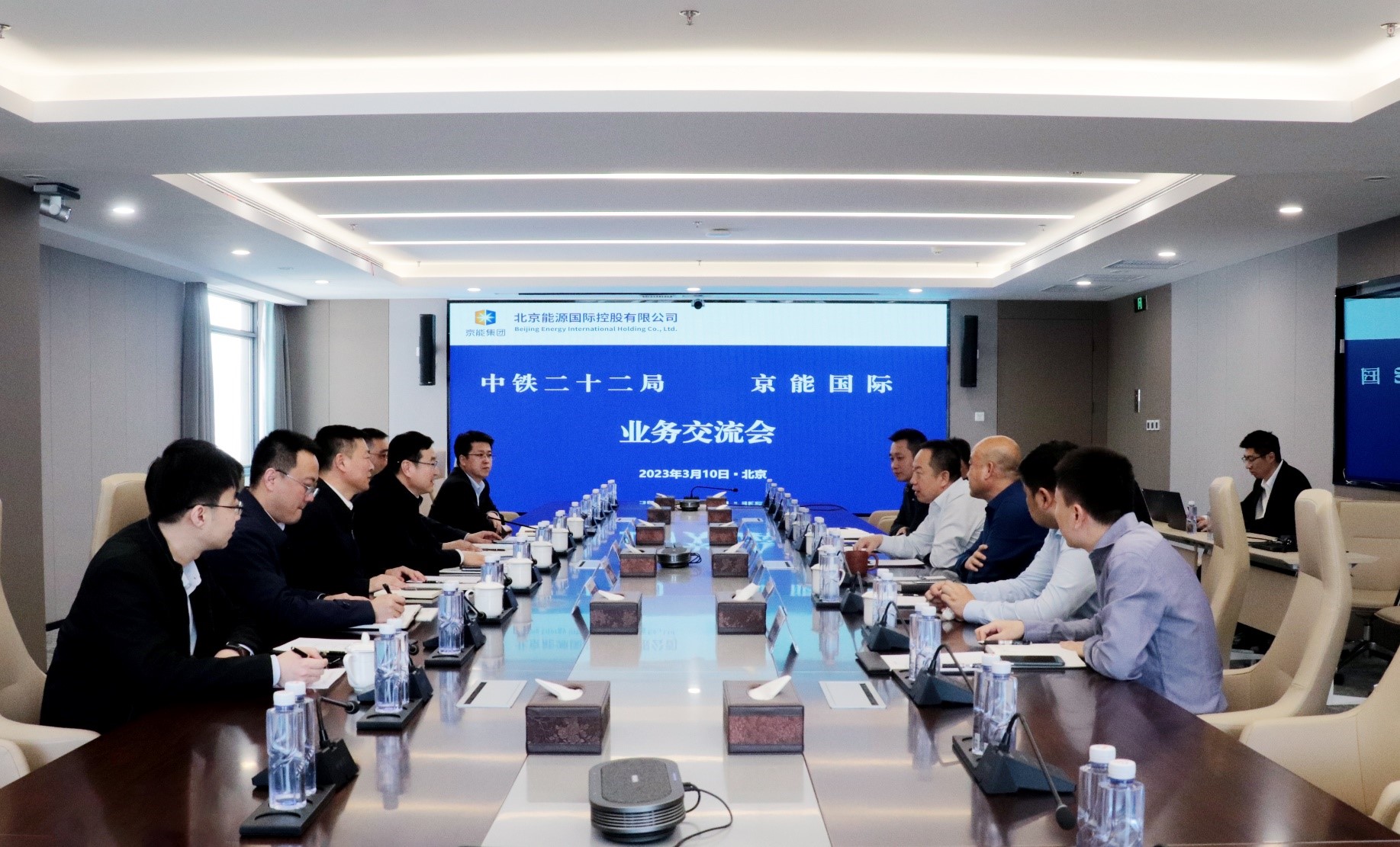 On March 10, 2023, Zhang Ping, chairman of the Board of Directors of Beijing Energy International, met with Zhao Hongying, party secretary and chairman of China Railway 22nd Bureau Group Co., Ltd. (CR22) in Beijing. The two sides exchanged on in-depth cooperation in new energy.